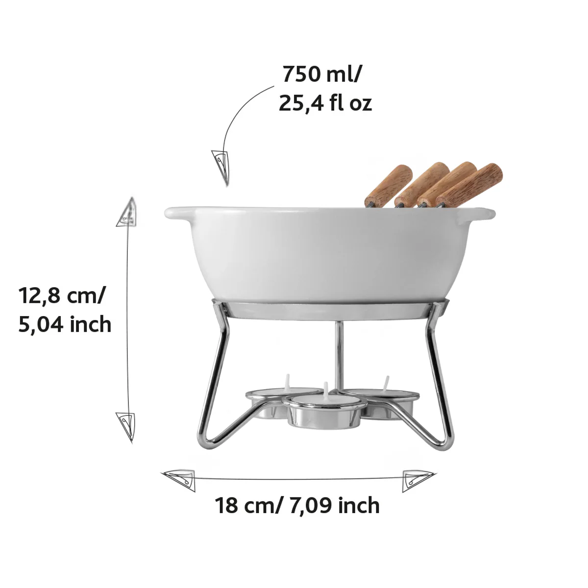 • Compacte fondueset: Met een inhoud van 750 ml en ruimte voor 500 gram kaasfondue, is de aardewerk fonduepan ideaal voor een kaas fonduemaaltijd voor 2 personen of snack voor 4 personen.